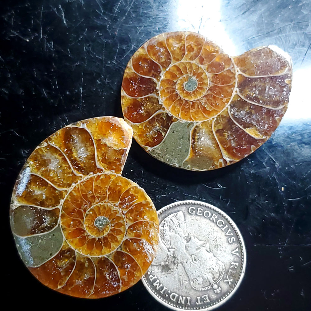 .75″ across. Mirrored halves. Each half is sold individually