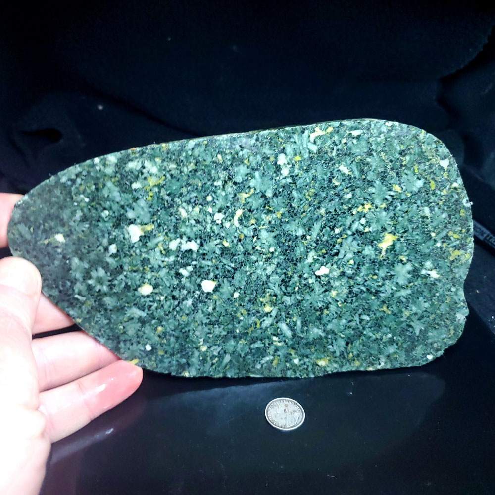 Weighs roughly 11 oz, measures roughly 7″ across. This is a slab