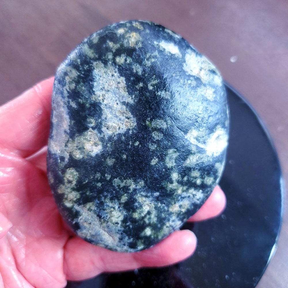 Palm stones are uncut jade or Gem serpentine rocks that are small enough to fit in the palm of your hand.  Pictures are taken with the stone oiled and using a flash camera to bring out the natural green color.  These palm stones have not been polished and are in their natural state.